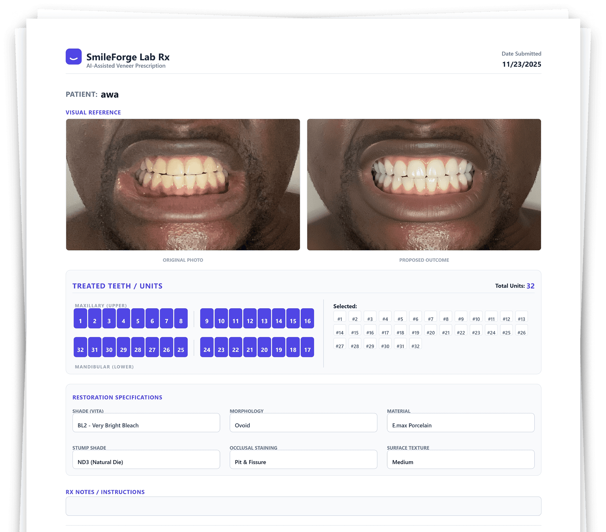 SmileForge turns a single photo into a realistic, manufacturable smile preview and a standardized lab prescription. All before the conversation even starts.